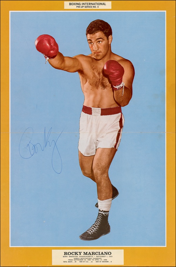 Fabulous color 11 x 16.5 Boxing International magazine pin-up of Marciano, clad in white trunks with red trim, throwing a jab, signed in blue ballpoint, “Rocky.” In fine condition, with small portion of signature over bisecting horizontal fold, a couple small separations along fold, and some scattered light creases and wrinkles, mostly to edges. Auction LOA Steve Grad/PSA/DNA and R&R COA.