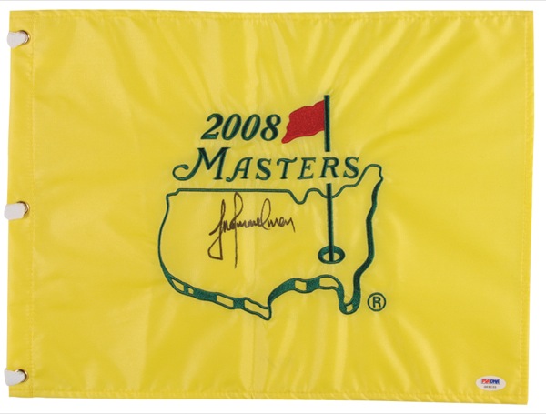 Yellow souvenir flag from the 2008 Master’s Tournament, 17.5 x 13, signed in black felt tip. Accompanied by a PSA/DNA certificate of authenticity. Small authentication label, otherwise very fine, clean condition. Auction LOA Steve Grad/PSA/DNA and R&R COA.