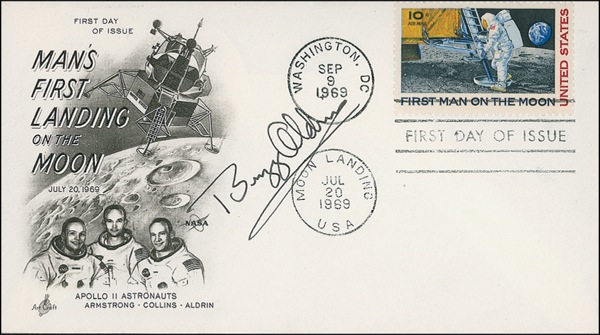 FDC with a cachet honoring man’s first landing on the moon, signed on the front in black ink. In very fine condition. R&R COA.
