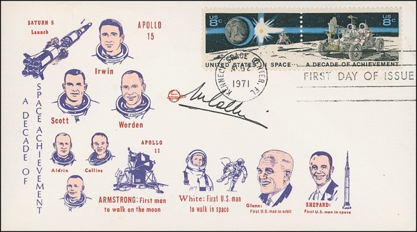 FDC with a cachet honoring a decade of space achievement and its milestones, signed on the front in black ink by Collins. In very fine condition. R&R COA.