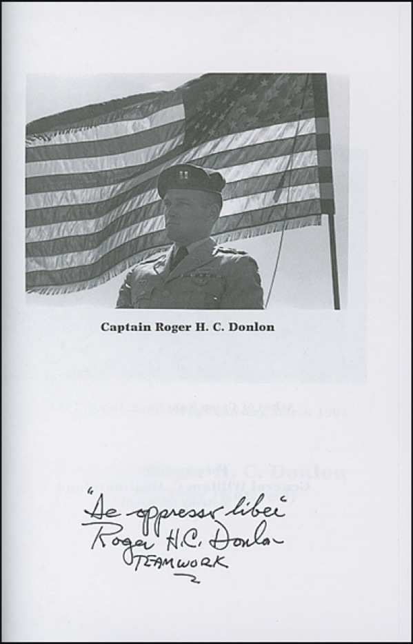 Two books: Beyond Nam Dong (hardcover, later printing), signed “De oppresso liber, Roger H. C. Donlan, Teamwork”; and A Soldier’s Report (softcover), signed W[illiam] C. Westmoreland. A hint of trivial wear to Westmoreland cover, otherwise very fine condition. R&R COA.