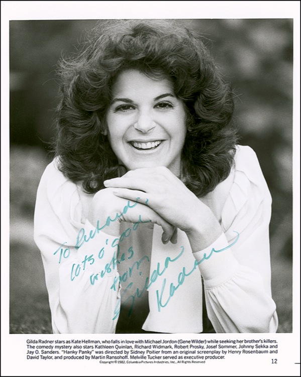Glossy 8 x 10 publicity photo from Hanky Panky, signed and inscribed in green felt tip “To Richard, Lots o’ good wishes from Gilda Radner.” Tiny ding to background, otherwise very fine condition. R&R COA.