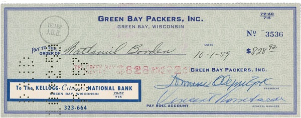 Green bay Packers business check, 8.5 x 3.25, filled out in another hand and signed by Lombardi, payable to defensive end Nathaniel Borden for $828.92, October 1, 1959. In fine condition, with expected holes and stamps, and a bisecting vertical crease affecting first letter of signature. Auction LOA Steve Grad/PSA/DNA and R&R COA.
