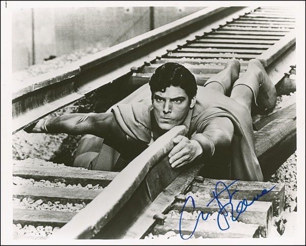 Glossy 10 x 8 photo of Reeve as Superman preparing to save a train from certain doom, signed in blue felt tip. In fine condition, with a few scattered light surface marks. R&R COA.