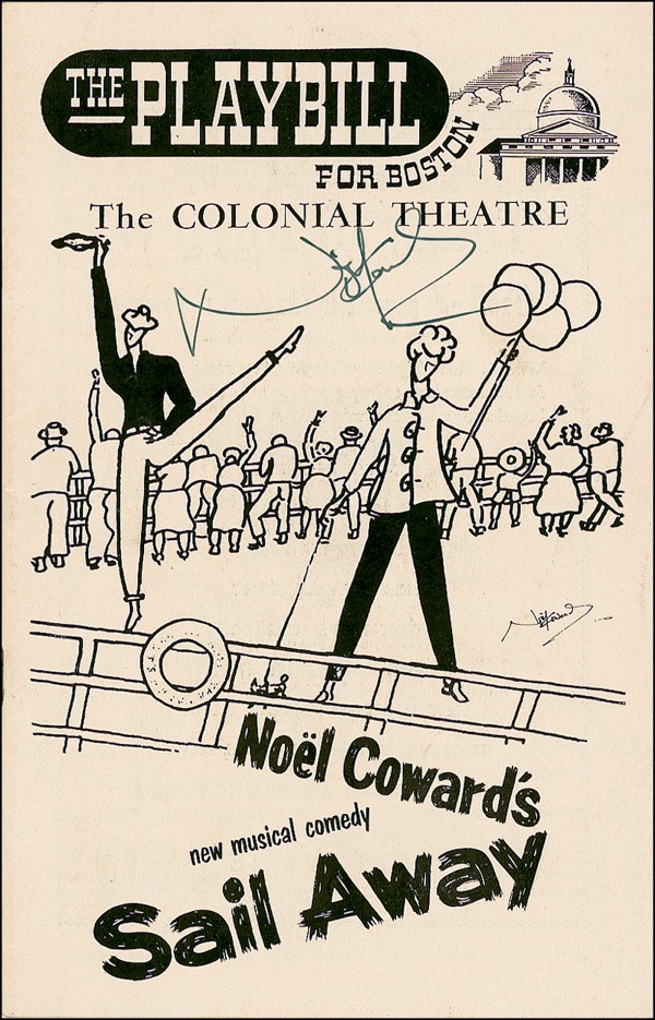Vintage Playbill for Boston’s Colonial Theatre’s production of Sail Away, signed on the front cover in fountain pen by Coward, and also signed inside on the cast page by 16 actors and actresses, including Elaine Stritch and Jean Finn. In fine condition, with some mild handling wear and a couple light cover creases. R&R COA.