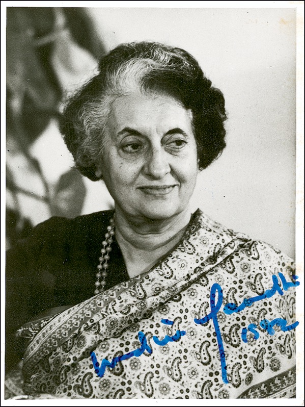 Matte-finish 4.25 x 5.75 photo, signed in blue felt tip, “Indira Gandhi 1982.” Some scattered light surface bends and impressions, and a bit of light soiling to edges, otherwise fine condition. R&R COA.