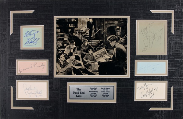Ink and felt tip signatures of Huntz Hall, Leo B. Gorcey, Billy Halop, Bobby Jordan, Bernard Punsly, and Gabriel Dell on individual album pages and off-white cards. All are double matted together with an original studio still from the film Angels With Dirty Faces, and an informational plaque, to an overall size of 24.5 x 16. In fine condition. R&R COA. Oversized.