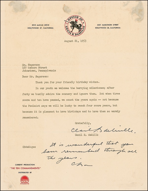 TLS, one page, 8.5 x 11, business letterhead, August 21, 1953. DeMille writes to an admirer. In full: “Thank you for your friendly birthday wishes. In our youth we welcome the hurrying milestones; after forty we busily admire the scenery and ignore them. But when three score and ten have passed, we count the years again—not because the Psalmist says we will be lucky to reach four score years, but because it is pleasant to have birthdays and to have them so warmly remembered….” After signing, DeMille adds a handwritten postscript of appreciation. A few light wrinkles and show-through of mounting remnants to reverse, otherwise fine condition. R&R COA.