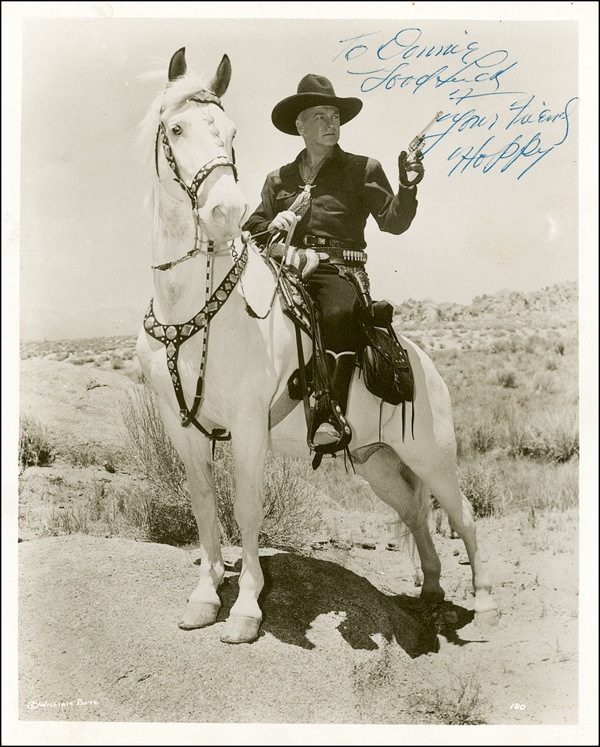 Vintage matte-finish 8 x 10 photo of Hopalong Cassidy atop his horse, signed and inscribed in blue ballpoint “To Donnie, Good luck, Your friend, Hoppy.” In fine condition, with just a few light bends and dings. R&R COA.