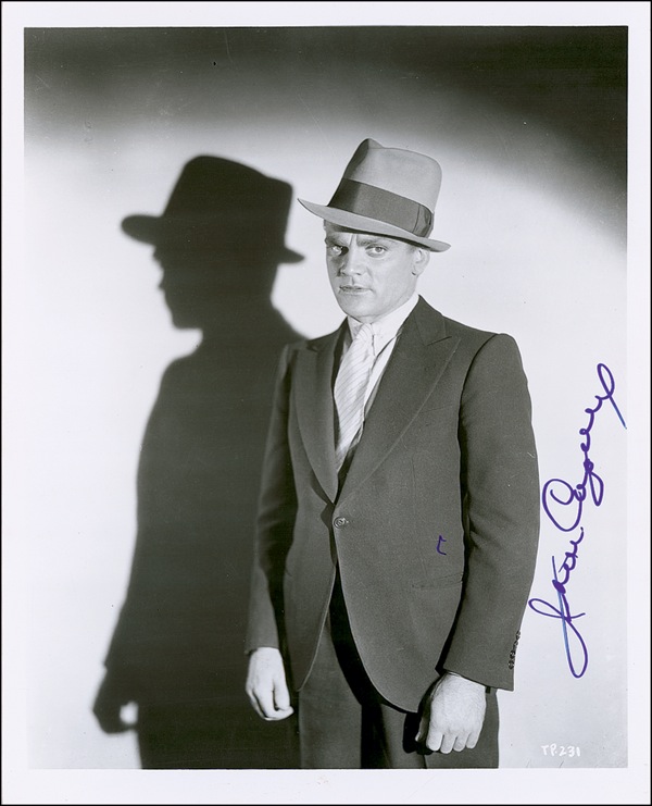 Glossy 8 x 10 photo of a scowling Cagney and his shadow, signed in blue felt tip. A few dings and surface marks, otherwise fine condition. R&R COA.