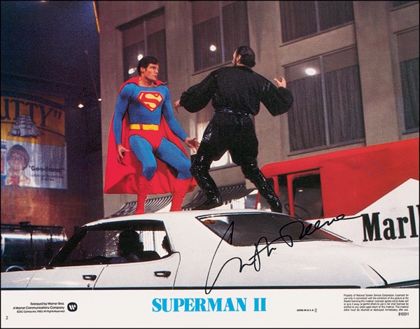 Two color 14 x 11 lobby cards from Superman II, showing Superman battling two different enemies, each signed in black felt tip by Reeve. In fine condition. R&R COA.
