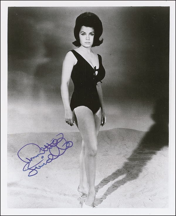Glossy 8 x 10 photo of Funicello in a surprisingly low-cut bathing suit, signed in blue felt tip. In fine condition, with some scattered light surface creases and impressions. Sadly, she no longer signs. R&R COA.