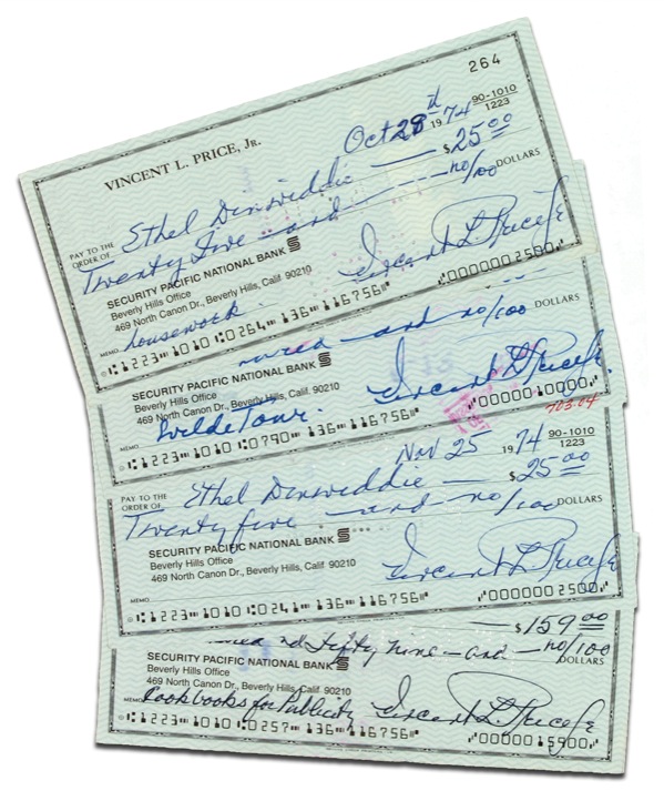 Four personal checks, each 6 x 2.75, all filled out and signed by Price, “Vincent L. Price, Jr.,” all dated from the mid 1970s, with one also endorsed on the reverse by Price. In fine condition, with expected holes and stamps, lightly affecting a couple of signatures. R&R COA.
