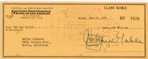 Personal check, 8.5 x 3.25, filled out in type and signed by Gable, payable to Encino Pharmacy for $10.29, May 10, 1950. In very good condition, with show-through from stamps on reverse, and cancellation holes and stamps over first name of signature. PSA/DNA Auction LOA and R&R COA.