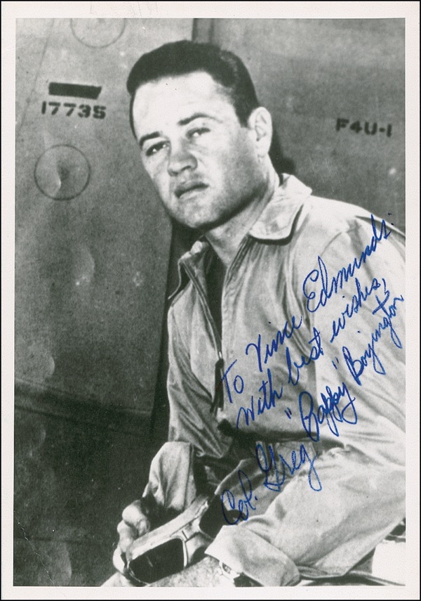 Matte-finish 5 x 7 photo, signed and inscribed in blue ink, “To Vince Edmunds with best wishes, Col. Greg ‘Pappy’ Boyington.” A few small creases and surface marks, otherwise fine condition. R&R COA.
