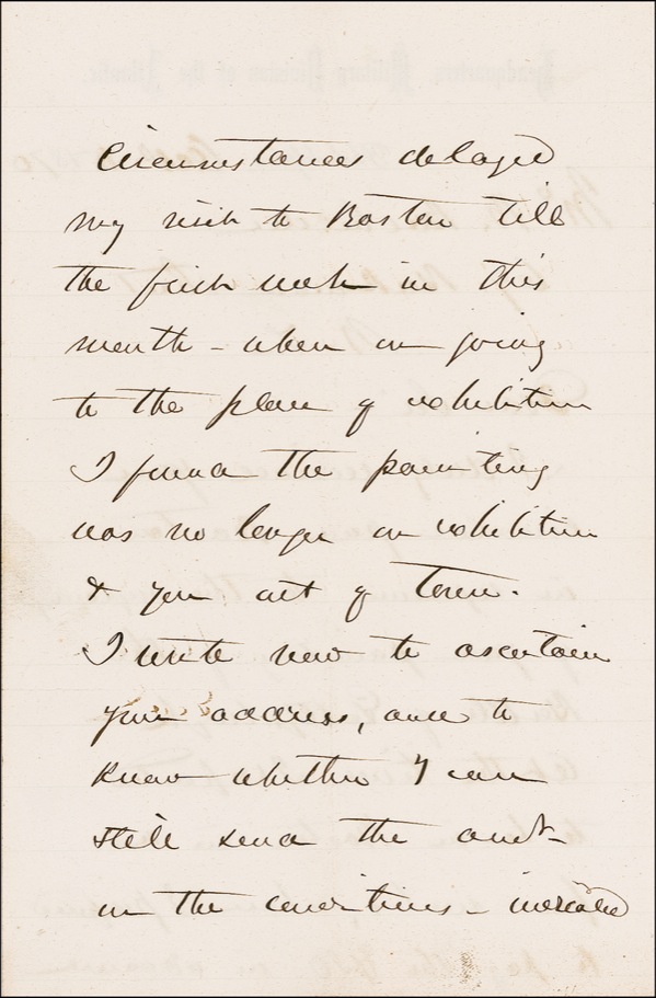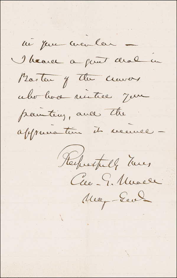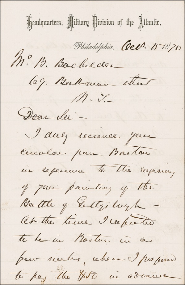 Distinguished Union general (1815–1872) best known for leading his troops to a commanding victory over Lee’s Confederates at Gettysburg in one of the pivotal battles of the Civil War. ALS signed “Geo. G. Meade,” three lightly lined pages on two adjoining sheets, 5 x 7.75, Headquarters, Military Division of the Atlantic letterhead, October 15, 1870. Meade writes to artist and Gettysburg historian John B. Bachelder (1825–1894). In full: “I duly received your circular from Boston in reference to the repairing of your painting of the Battle of Gettysburgh [sic]. At the time I expected to be in Boston in a few weeks, when I proffered to pay the $50 in advance. Circumstances delayed my visit to Boston till the first week in this month—when in going to the place of exhibition I found the painting was no longer in exhibition & you out of town. I write now to ascertain your address, and to know whether I can still send the amt. in the directions indicated in your circular. I heard a great deal in Boston of the crowds who had visited your painting, and the appreciation it received….” The painting in question is the monumental “Repulse of Longstreet’s Assault at the Battle of Gettysburg” by James Walker. Bachelder, who commissioned the painting from Walker and supervised completion of the 7.5´ x 20´ work, took the painting with him on a lecture tour of the United States; it was later published as an engraving. Intersecting folds (vertical fold to first name), and a touch of subtle soiling and handling wear, otherwise fine, bright condition. R&R COA.
