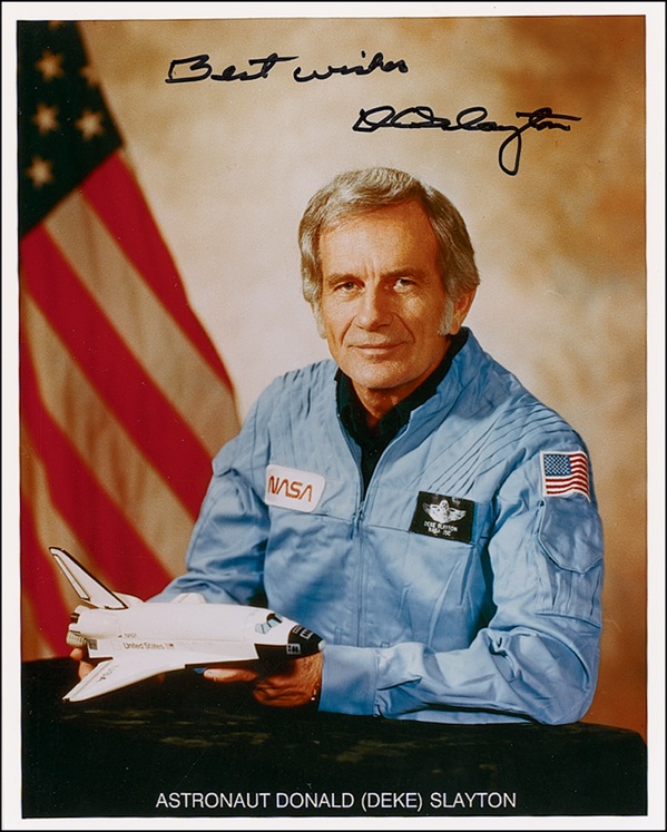 Color satin-finish 8 x 10 photo of Slayton posing with a model of the space shuttle, signed in black felt tip, “Best wishes, Deke Slayton.” In very fine condition. R&R COA.