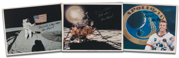 Four different color 10 x 8 NASA photos, each inscribed in silver ink or felt tip to Roger & Hattie and signed “Alan Shepard.” Slightly irregular ink flow to one inscription, and photos partly affixed to magnetic photo album pages (two on opposite sides; can probably be carefully separated), otherwise fine condition. R&R COA.