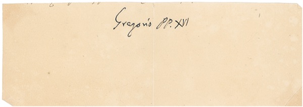 Born Bartolomeo Alberto Cappellari (1765-1846), he was Pope of the Catholic Church from 1831 to 1846. Strongly conservative and traditionalist, he opposed democratic and modernizing reforms in the Papal States and throughout Europe, seeing them as fronts for revolutionary leftism, and sought to strengthen the religious and political authority of the papacy Ink signature, “Gregoius PP XVI,” on an off-white 7.25 x 2.5 slip, clipped from a larger document or letter. In fine condition, with bisecting vertical fold, not touching signature, and a few other creases, and a small tear to bottom edge. R&R COA.