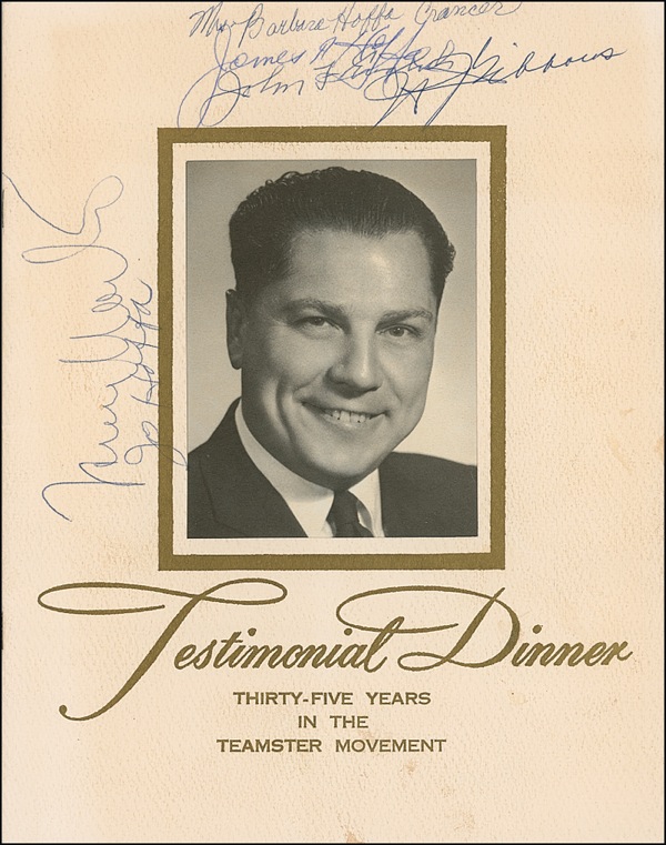 Storied, charismatic, and controversial American labor leader (1913–1975?) who attained his greatest notoriety when he vanished on July 30, 1975. The truth behind his presumed demise and the whereabouts of his remains take a place among the most durable mysteries in modern American history. Program from a 1965 dinner given in honor of Hoffa’s 35 years in the Teamster movement, 8.5 x 11, signed on the cover in ballpoint “James. R. Hoffa.” The cover has been also been signed by several other labor figures and family members, including Jo Hoffa and Barbara Hoffa Crancer; the back cover has been similarly signed by approximately 22, including notorious crime boss and Genovese family capo Anthony “Tony Pro” Provenzano (1917–1988), a longtime associate of Hoffa who was the vice president of the Teamsters Local 560 in Union City, New Jersey. Light soiling and handling wear, a few small stains, and two other signatures sightly overlapping Hoffa’s, otherwise fine condition. R&R COA.