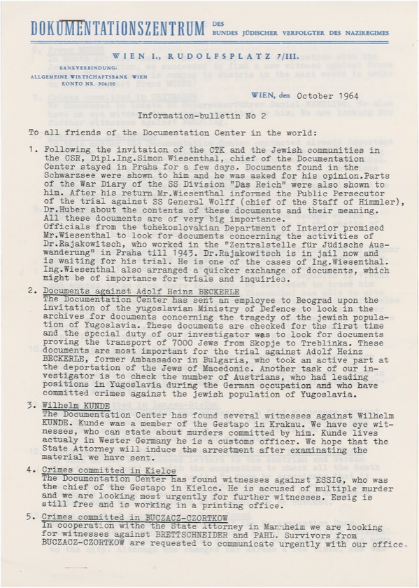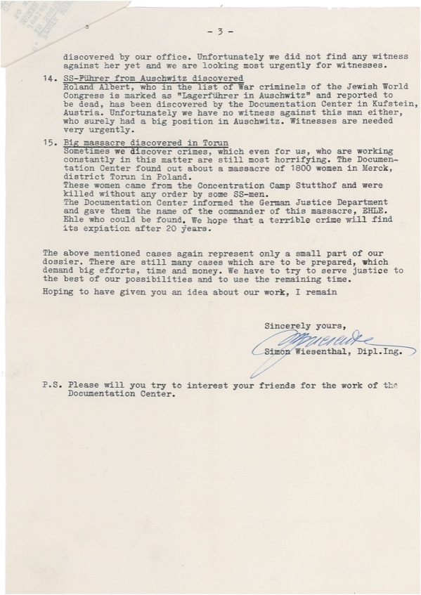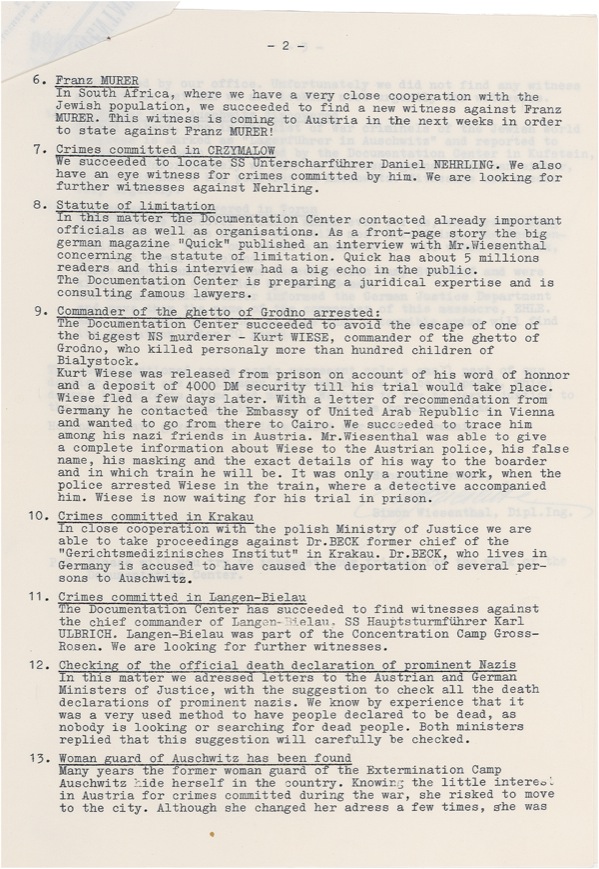 Nazi concentration camp survivor (1908–2005) who dedicated his life to tracking down and prosecuting former Nazis who had persecuted Jews during World War II. He made worldwide headlines in 1961 for the capture of notorious Nazi fugitive Adolf Eichmann. DS, three pages, 8.25 x 11.5, Dokkumentationszentrum des Bundes Jüdischer Verfolgter des Naziregimes letterhead, October 1964. A memo, titled “Information Bulletin No. 2,” outlining progress in the search for evidence implicating various Nazis, including Adolf Heinz Beckerle, Franz Murer, and others. Accompanied by the original mailing envelope. Intersecting folds and light handling wear, otherwise fine condition. R&R COA.