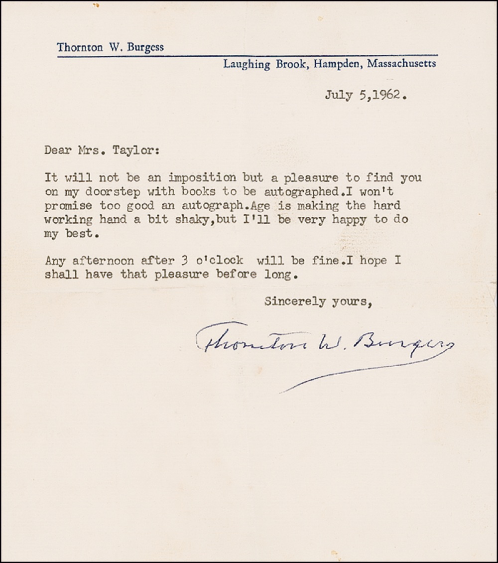 American writer who, drawing on the bedtime stories he told to his son, published 54 books of stories for children, many featuring a cast of animals with human names and behavior. TLS, one page, 6 x 7, personal letterhead, July 5, 1962. Very polite letter to a collector. In part, “It will not be an imposition but a pleasure to find you on my doorstep with books to be autographed. I won’t promise too good an autograph. Age is making the hard working hand a bit shaky.” Intersecting folds, one through first name of signature, a couple edge dings and creases, and a touch of mild toning, otherwise fine condition. R&R COA. RRAuction COA.