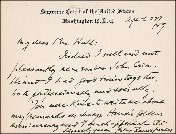 Associate Justice of the U. S. Supreme Court (1882–1965) from 1939 to 1962. ALS, one page, 4.5 x 3.5, Supreme Court letterhead, April 28, 1959. Letter of thanks for a previous note. In part, “Indeed I well and most pleasantly remember John Crim…You were kind to write me about my remarks on Judge Hendo’s golden anniversary and I much appreciate it.” In fine condition, with signature a bit cramped, and a bit of trivial surface loss along top edge. R&R COA.