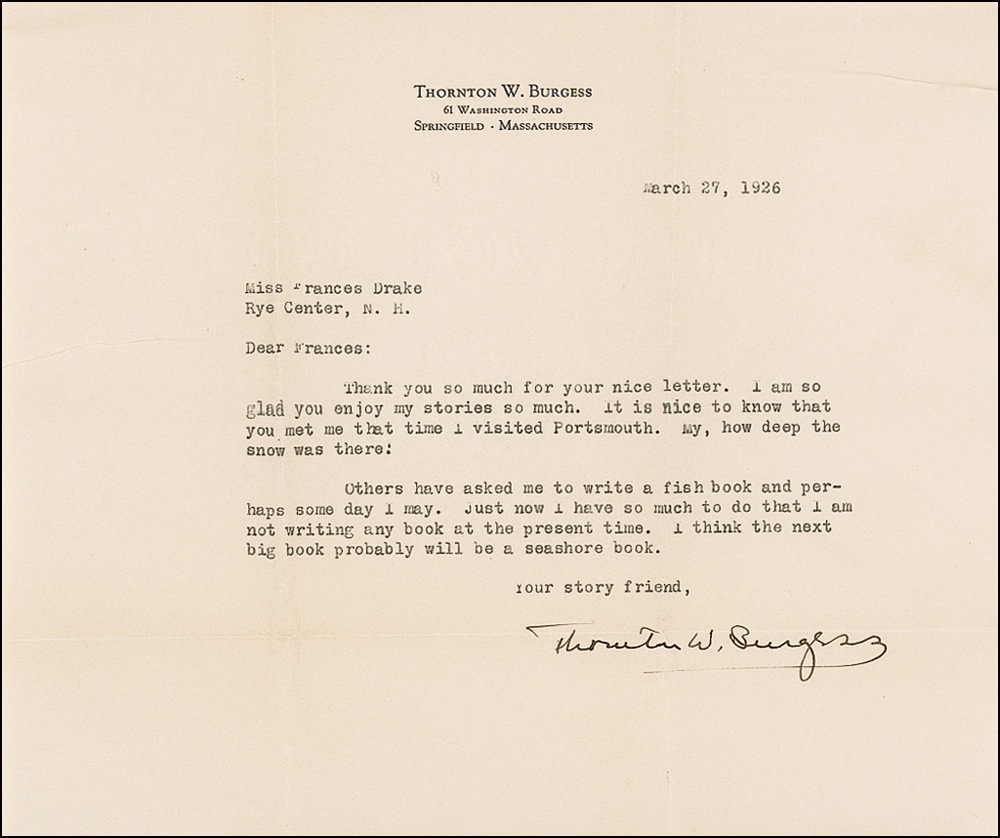 American author (1874–1965) best known for his popular children’s stories featuring a colorful cast of animal characters. TLS, one page trimmed at the bottom edge to an overall size of 8.25 x 7, personal letterhead, March 27, 1926. Burgess writes to Frances Drake in Rye Center, New Hampshire. In part: “I am so glad you enjoy my stories so much…. Others have asked me to write a fish book and perhaps some day I may. Just now I have so much to do that I am not writing any book at the present time. I think the next big book will probably be a seashore book….” Accompanied by the original mailing envelope. Trimming as noted, light wrinkling, and intersecting mailing folds (touching signature), otherwise fine condition. RRAuction COA.