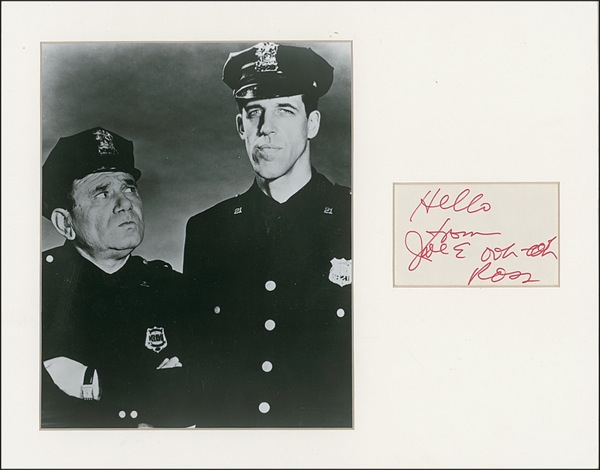 Played Officer Gunther Toody on the 1960s sitcom Car 54, Where Are You? Felt tip signature, “Hello from Joe E. ooh ooh Ross,” on an off-white card. Matted with a glossy photo of officers Muldoon and Toody, to an overall size of 14 x 11. In fine condition. R&R COA.