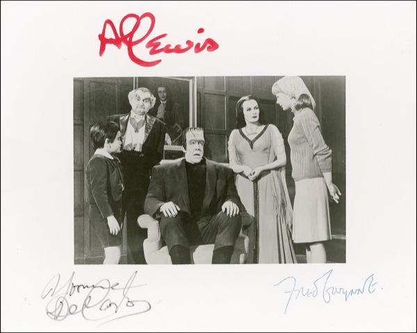 Glossy 10 x 8 photo of the Munster family, signed in blue ballpoint by Fred Gwynne, in black felt tip by Yvonne DeCarlo, and in red felt tip by Al Lewis. In very fine condition. Gwynne was known to hate being associated to the character of Herman Munster and usually refused to sign Munster items. R&R COA.