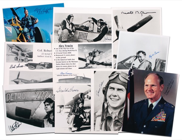 Ten signed 8 x 10 and 10 x 8 photos, including two color, each signed in felt tip by the respective American ace pictured. Signers are: Chuck DeBellevue, Bob Scott, Urban Drew, Jim Goodson, Alex Vraciu, Gerald Brown, Herschel Green, Roy Evans, Frederick Blesse, and Jerry Johnson. In fine condition. R&R COA.