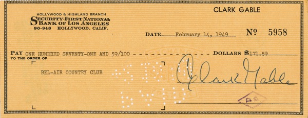 Personal check, 8.25 x 3.25, filled out in type and signed by Gable, payable to Bel-Air Country Club for $171.59, February 14, 1949. Vertical fold (away from signature) and usual ink and punch cancellations (the latter touching “C”), otherwise fine condition. PSA/DNA Auction LOA and R&R COA.