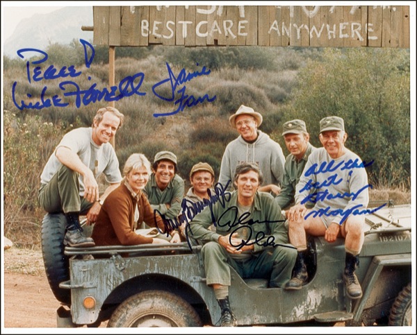 Color glossy 10 x 8 cast photo, signed in blue and black felt tip by Alan Alda, Mike Farrell, Jamie Farr, Gary Burghoff, and Harry Morgan. In very fine condition. R&R COA.
