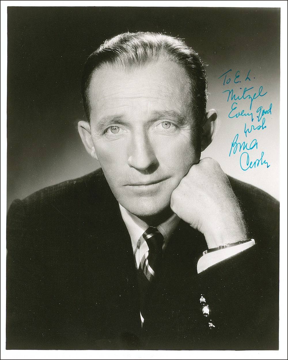 Vintage matte-finish 8 x 10 photo, signed and inscribed in ink, “To E. L. Mitzel, Every good wish, Bing Crosby.” Small, faint bend to right edge and a very subtle suggestion of rippling, otherwise fine, fresh condition. R&R COA.