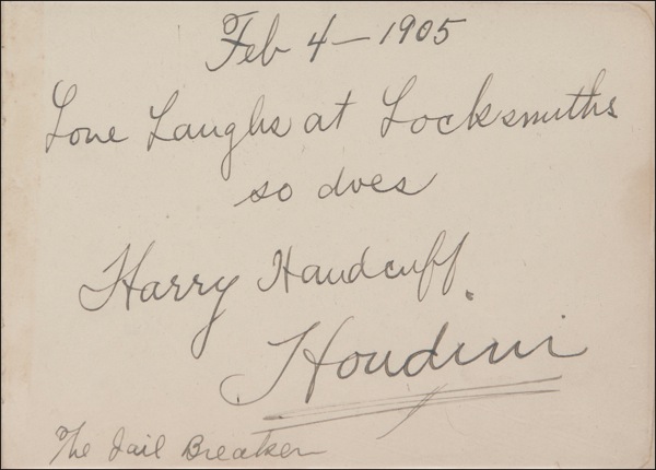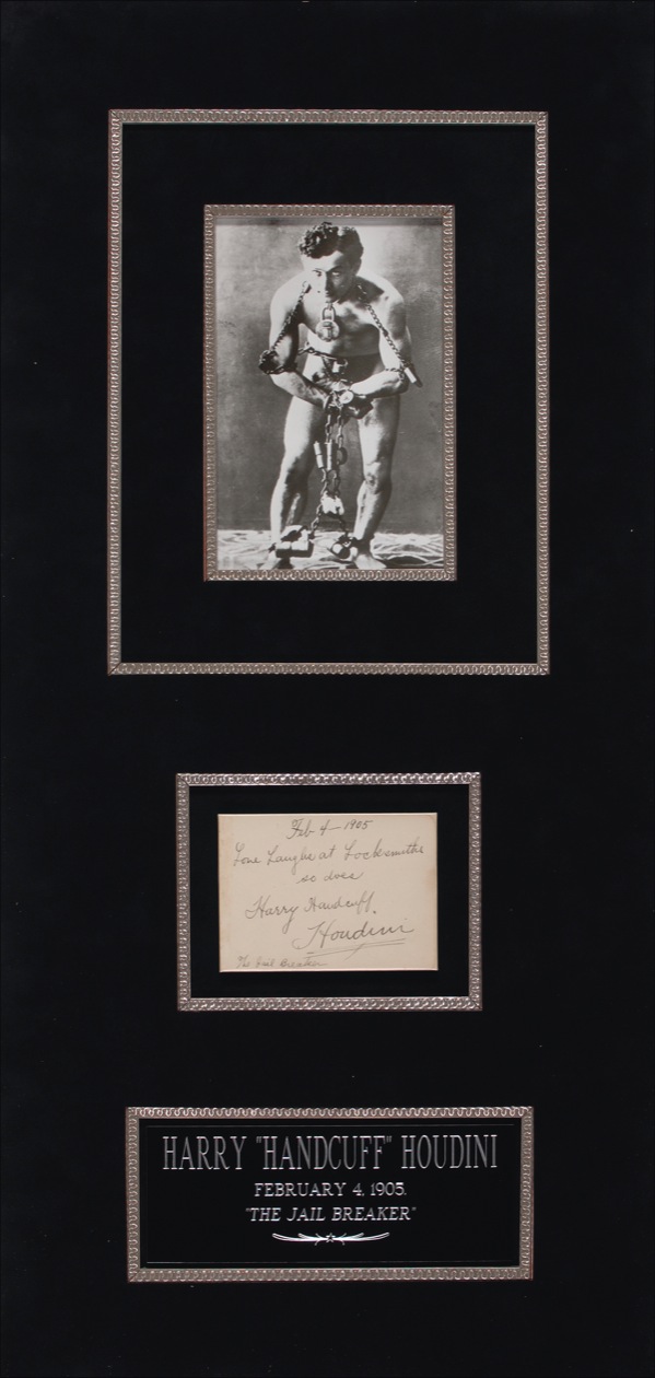 Hungarian-born American magician (1874–1926), né Erik Weisz, who would ultimately attain a place among the greatest practicioners in the history of the art. From his early success as the “King of Cards,” Houdini (who took his stage name from his idol, French magician Jean Eugène Robert-Houdin), went on to create ever grander and more elaborate illusions, many of which spectacularly showcased his remarkable physical prowess and skill as an escape artist. An ardent debunker of phony mediums, yet a believer in spiritualism himself, Houdini came to an untimely end when, punched in the abdomen unprepared by a college student who wished to test the magician’s strength, he suffered from a ruptured appendix. After performing a full show in Detroit with a high fever, he died of peritonitis on Halloween, 1926 at the age of 52. Vintage ink signature, “Love Laughs at Locksmiths, So does Harry Handcuff Houdini, The Jail Breaker,” on a white 4.75 x 3.5 card dated February 4, 1905. Suede matted with a name plaque and photo to an overall size of 15 x 31. In fine condition, with some mild toning along left edge. Oversized. R&R COA.