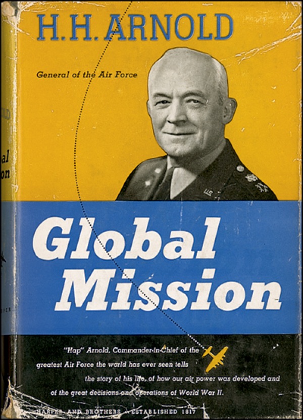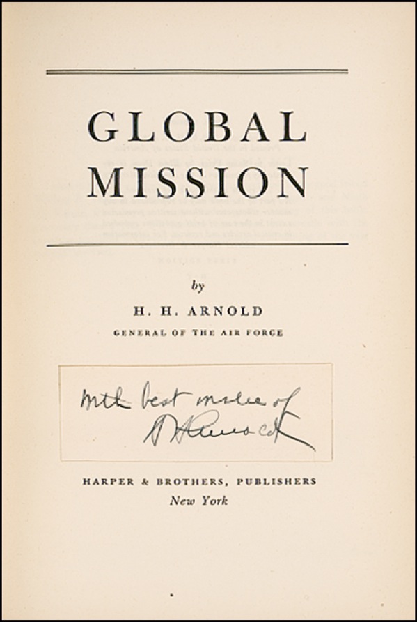 Vintage ink signature, “With best wishes of H. H. Arnold,” on an off-white 3.5 x 1 card which has been affixed to the title page of a first-edition copy of his 1949 book Global Mission. Wear, creasing, and soiling to jacket of book, otherwise fine condition. R&R COA.