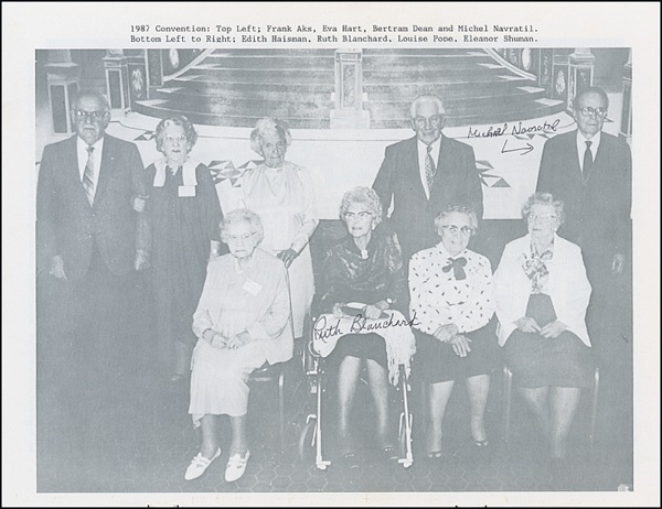 Two items: program from a 1992 gathering of the Titanic Historical Society in Boston, signed on the cover by Walter Lord and Eleanor Johnson Shuman, and on the interior by Louise “Kink” Pope; and a program from the 1988 25th Anniversary Convention of the same organization, signed on various pages, most near their respective photos, by Beatrice Sandstrom, MIllvina Dean, Bertram V. Dean, Frank Aks, Eva Hart, Ruth Blanchard, and Michael Navratil. Mild handling wear, otherwise fine condition. R&R COA.