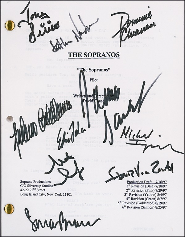 Brad-bound copy of a script for the pilot of The Sopranos, dated August 25, 1997, 8.5 x 11, 65 pages. Signed on the front cover in black felt tip by James Gandolfini, Edie Falco, Michael Imperioli, Tony Sirico, Steve Van Zandt, Dominic Chianese, Lorraine Braco, Steve Schirripa, Federico Castelluccio, and Katherine Narducci. In fine condition. R&R COA.