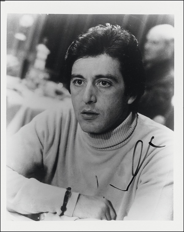 Two signed photos: a glossy 8 x 10 from early in his career, signed in black felt tip; and a color glossy 10 x 8 photo from Scarface, signed in blue felt tip. In very fine condition. R&R COA.
