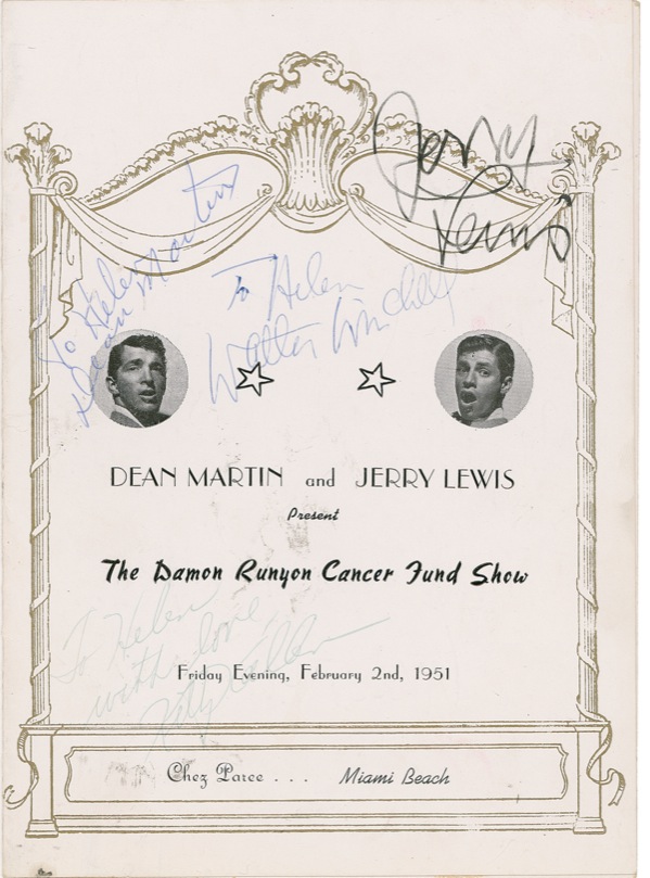 Program from the Damon Runyon Cancer Fund Show at Chez Paree, Miami Beach, February 2, 1951, 6.5 x 9, signed and inscribed on the cover in ballpoint “To Helen, Dean Martin,” and in black felt tip, “Jerry Lewis. The program has also been signed by Walter Winchell and Kitty Kallen. A touch of light soiling and handling wear, otherwise fine condition. R&R COA.