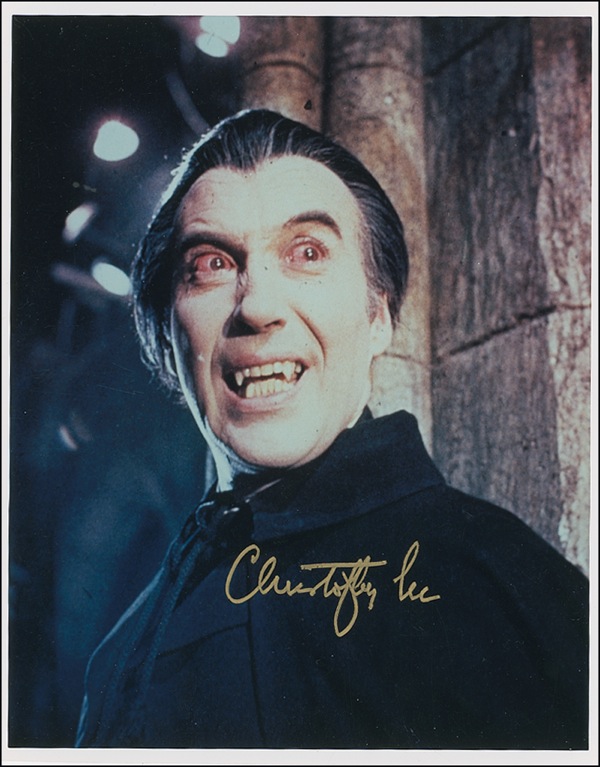 Color glossy 8 x 10 photo of Lee as Hammer Studios’ Dracula, signed in gold ink. Three trivial spots to background, otherwise very fine condition. R&R COA.