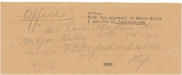 Personal deputy to Adolf Hitler (1894–1987). Convicted at Nuremberg and sentenced to a life sentence, he was incarcerated at Spandau Prison in Berlin, where, following the releases of fellow convicts Baldur von Schirach and Albert Speer in 1966, he remained the sole inmate for some two decades, until his death by apparent suicide. ANS in pencil, in German, signed “Hess,” one page on the reverse of a 7.75 x 3 slip clipped from a document, December 4 [no year]. In full [translated]: “Office: With the approval of Major Kelly I ask for my fountain pen.” A translation is typed above the written text. The printed side of the document has references to several cities in France and to the Gestapo, concentration camps, the “hygiene and work system,” and the mortality rate. Light even toning, a faint spot or two, and light handling wear (chip to bottom edge tape-repaired from reverse), otherwise fine condition. R&R COA.