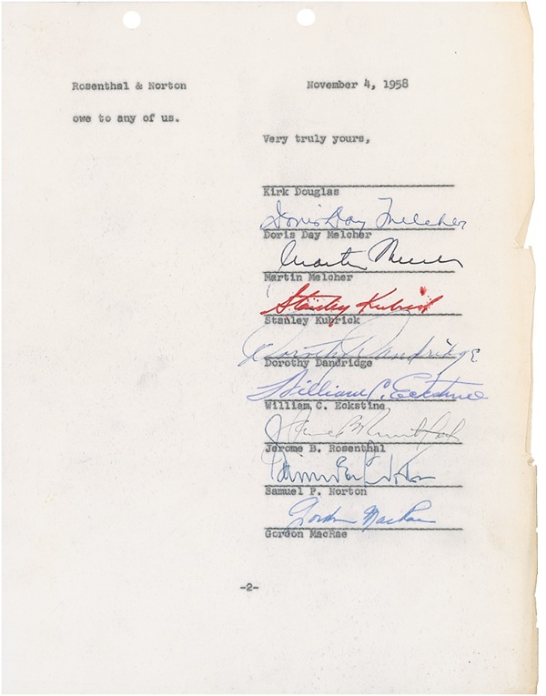 DS, two pages, 8.5 x 11, November 4, 1958. Farmout document related to a limited partnership in an Oklahoma oil and gas lease, signed in red ink by Kubrick and seven others including Doris Day Melcher. Punch holes to top edges, and small tears and creases to right edges, otherwise fine condition. R&R COA.