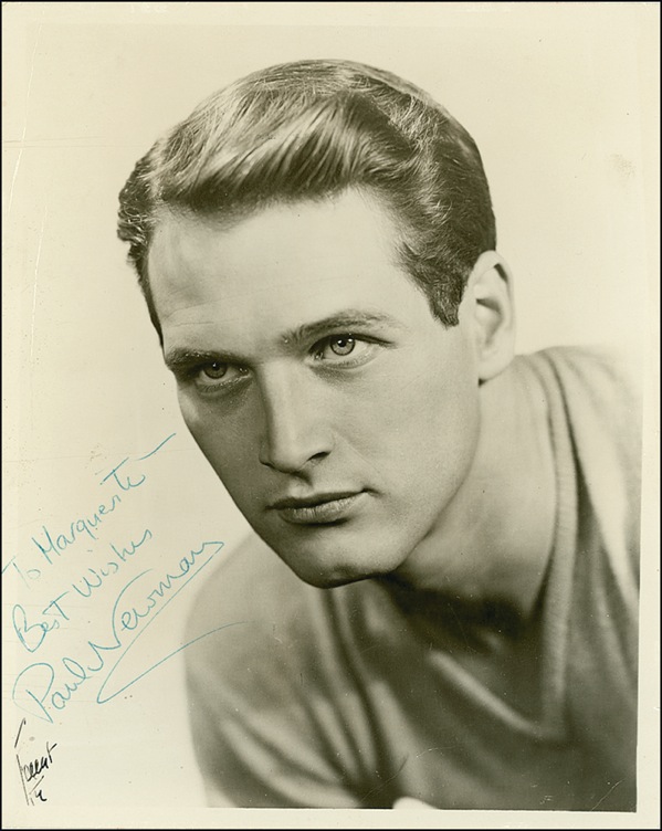 Early glossy 8 x 10 photo, signed and inscribed in ballpoint, “To Marguerite, Best wishes, Paul Newman.” In good condition, with scattered creases, impressions, and surface marks (a few touching face), and emulsion cracks touching inscription and first name of signature (not affecting legibility). R&R COA.