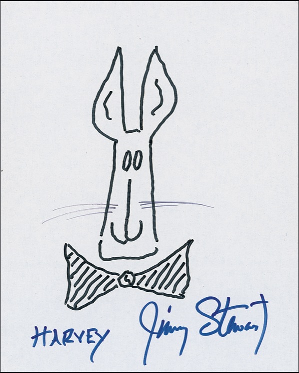Original felt tip sketch of Harvey on a white 8 x 9.75 card, signed “Harvey, Jimmy Stewart.” Small corner bends, otherwise fine condition. R&R COA.
