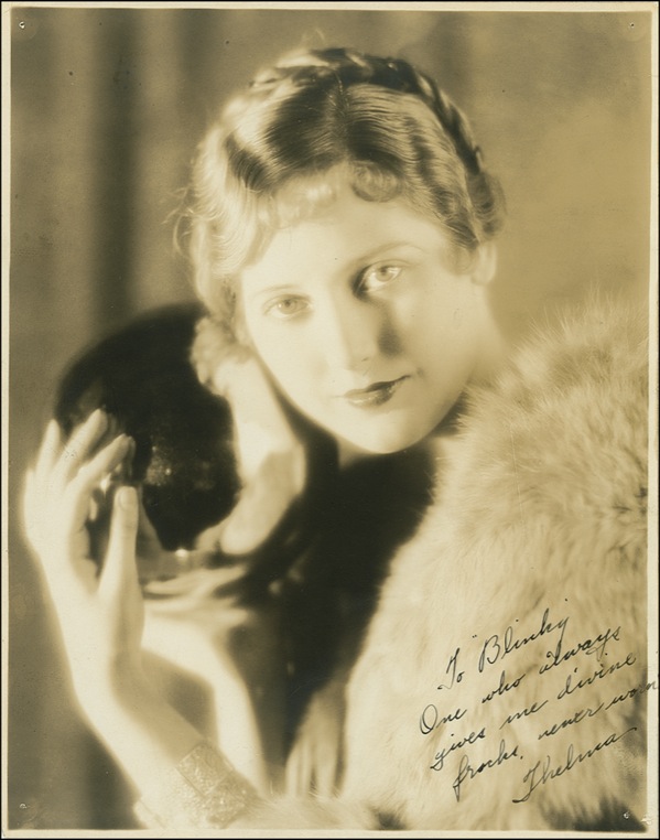 American actress (1905–1935) best remembered for her appearances in such comedy classics as Monkey Business, Horse Feathers, and Another Fine Mess. Though her death from carbon monoxide poison at the age of 30 was ruled an accident, suspicious circumstances led to a number of theories of varying plausibility, including speculation that she was the victim of a “hit” ordered by gangster “Lucky” Luciano. Early sepia matte-finish 7.5 x 9.5 photo of Todd nuzzling a mirrored ball, signed and inscribed in fountain pen, “To Blinky, One who always gives me divine frocks never worn, Thelma.” In fine condition, with pinholes to corners, a hint of subtle soiling, and faint scratch to fur. R&R COA.