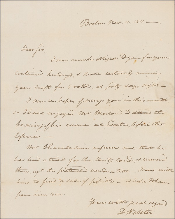 American politician (1782–1852), much esteemed for his eloquence as an orator, who was a longtime member of Congress and Secretary of State under Harrison and Tyler. Early ALS signed “D. Webster,” one page, 8 x 10, November 11, 1811. Webster writes from Boston to Nathaniel A. Haven in Portsmouth, New Hampshire. In part: “I am much obliged to you for your continued kindness, & shall certainly answer your draft for 500 dls…. I am in hopes of seeing you in this month, as I have engaged Mr. M— to attend the hearing of his cause at Exeter, before the referees. Mr. Chamberlain informs me that he has had a trial for the Unity lands, & recovered them….” The integral leaf bears the handwritten address panel. Intersecting folds (vertical fold to last name) and light wrinkling and handling wear, otherwise fine condition. R&R COA.