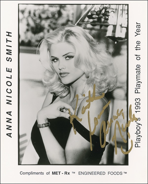 Glossy 8 x 10 publicity photo of Smith as Playmate of the Year, signed and inscribed in gold ink “Keith, Love Anna Nicole.” In very fine condition. R&R COA.