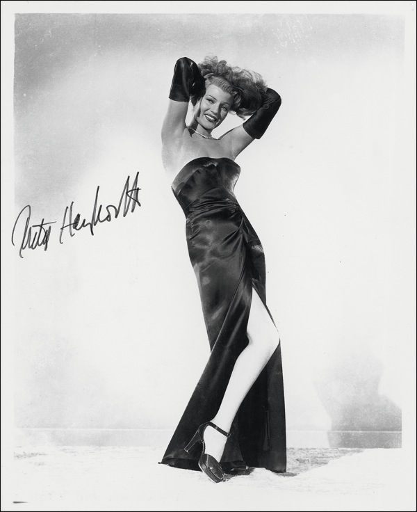 Fabulous glossy 8 x 10 full-length photo of Hayworth in the famous Jean Louis gown for the Blame It On Mame number in the 1946 classic Gilda, signed in black felt tip. In fine condition, with a few scattered light creases and surface marks. R&R COA.