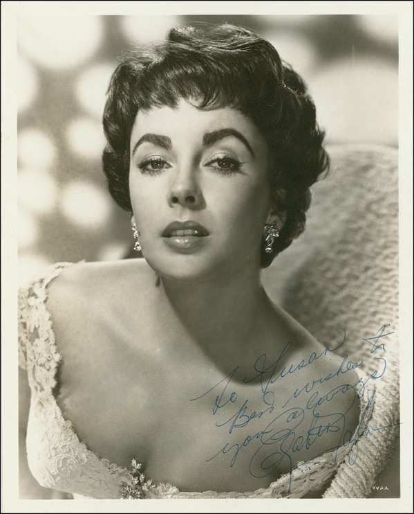 Vintage matte-finish 8 x 10 photo of Taylor leaning forward in a low-cut dress, signed and inscribed in blue ballpoint “To Susan, Best wishes to you always, Elizabeth Taylor.” In fine condition, with a bit of scattered light silvering. PSA/DNA Auction LOA and R&R COA.